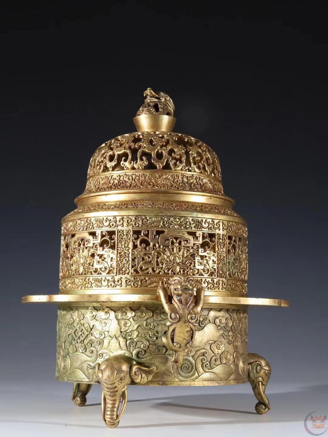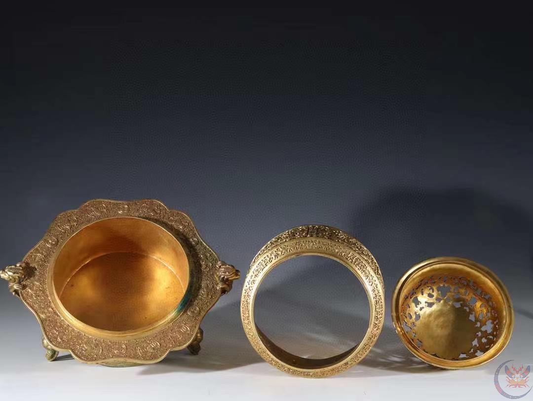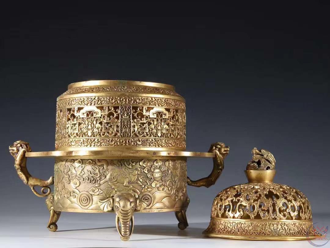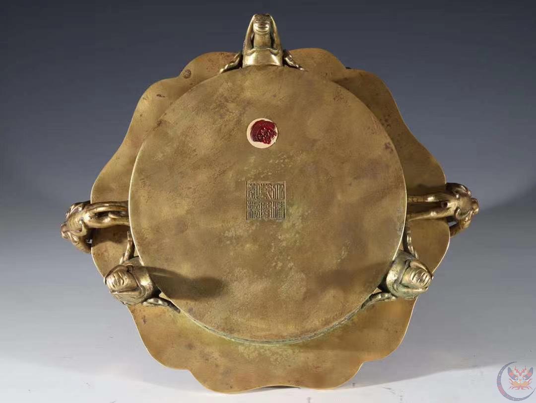 | 产品名称 : | 馆藏级 清代 铜鎏金 香薰炉 规格:高30.7cm 宽30cm 重11斤 精铜铸造,器形典雅,富贵堂皇,端庄秀色,精凿工艺非凡,线条清晰,品相极好。早期文物商店出货,贴有火漆鉴定印。 |