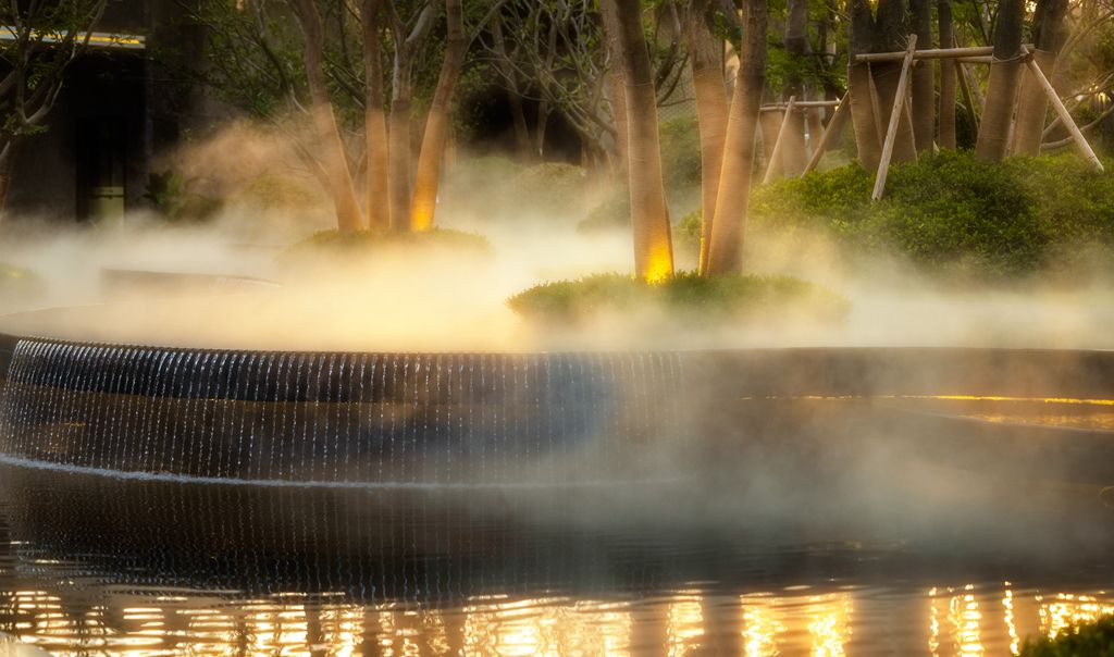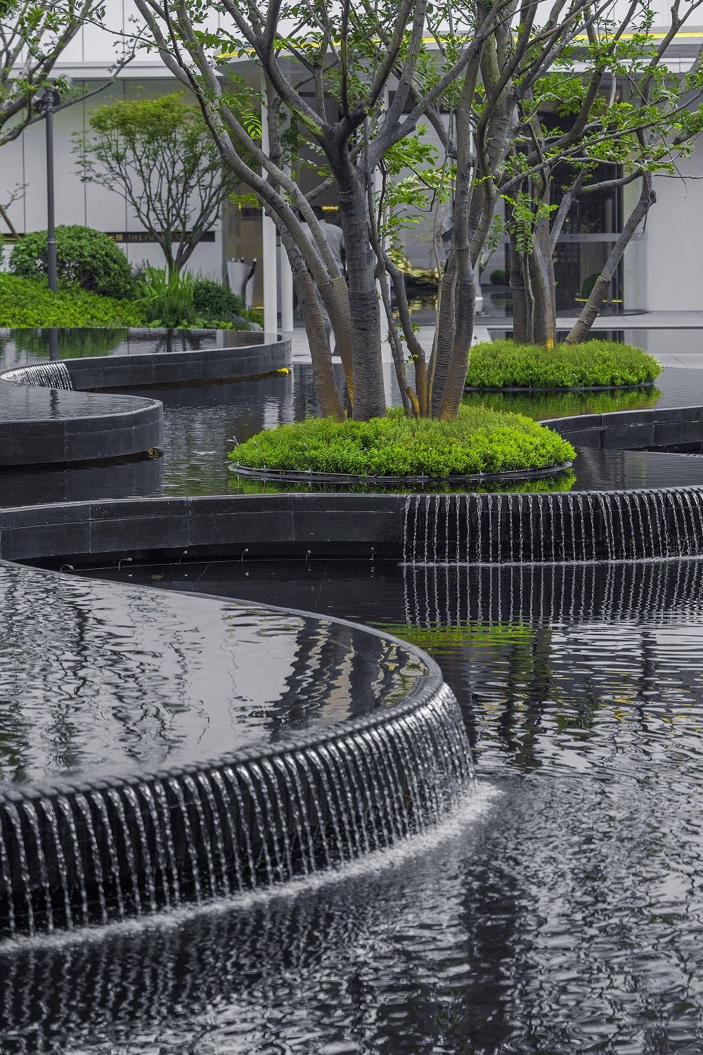街心花园水景呈椭圆形,中间配有云朵雕塑,四周加设涌泉。项目团队在水池中特地增加回流管,以保障泵坑水量充足,让涌泉呈现饱满均衡的效果。