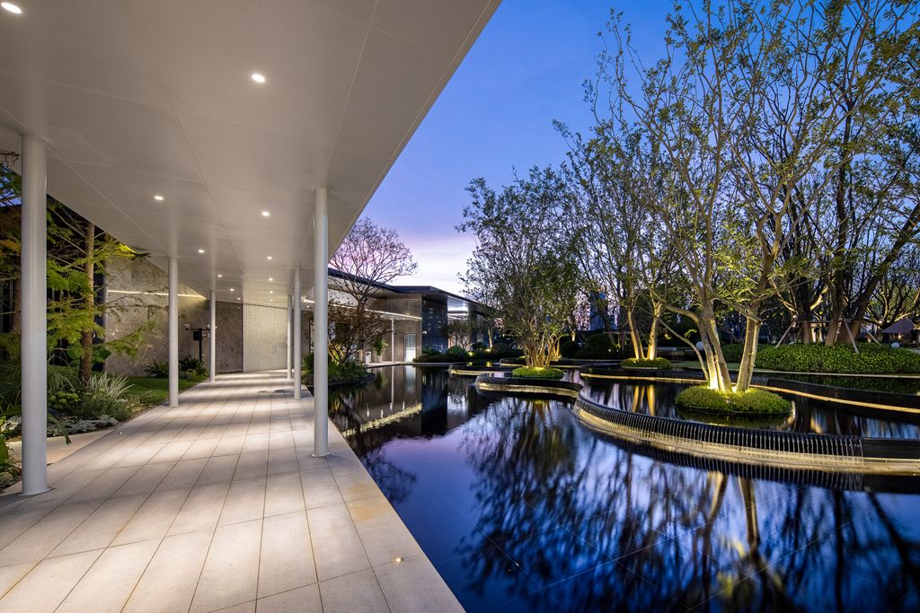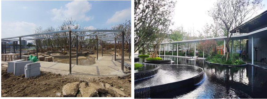 本项目为首推示范区景观,对材料选择、工艺要求极高。在项目施工过程中,施工图纸在原有的基础上发生数次改动,项目人员在结合现场的情况下不断深化,方案从初期概念阶段被定义为城市中的森林,现代和雅致贯穿总体工程思路;从空间大局的划分,到乌桕树的严选以及各个细节的揣摩,无一不经过用心的反复推敲。项目管理团队克服现场管理与效果把控上的困难,最终让『无锡美的·云璟』极致森活示范区景观完美落地。