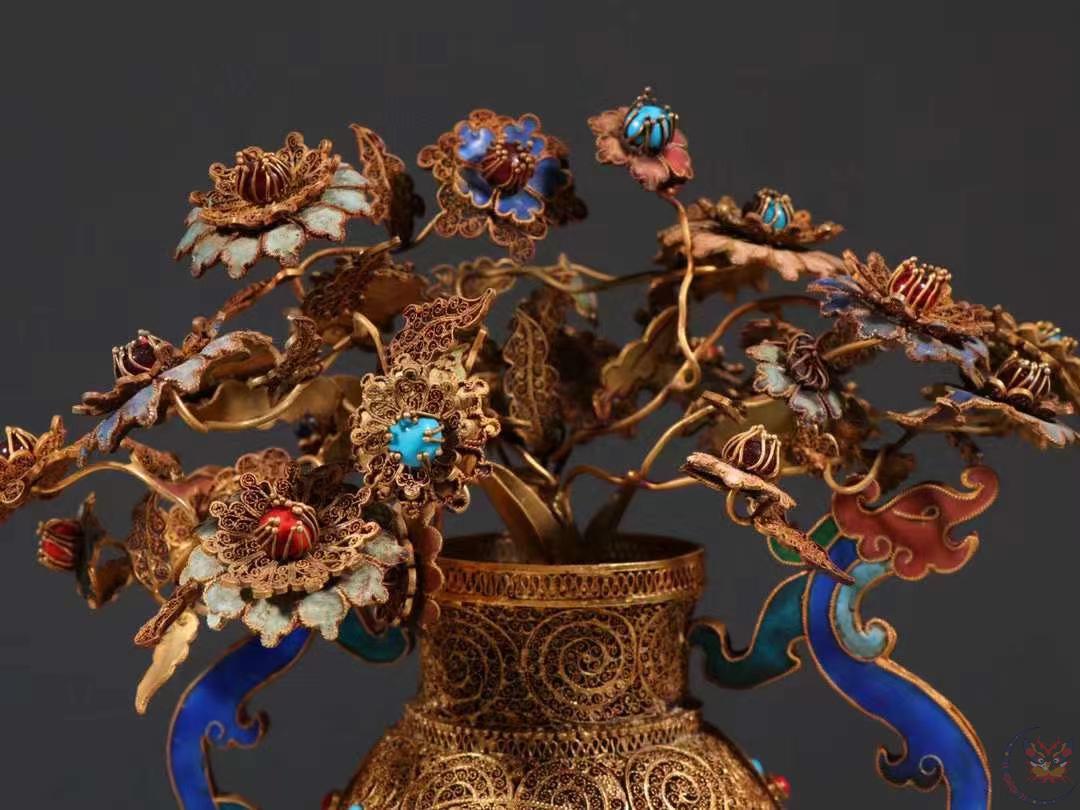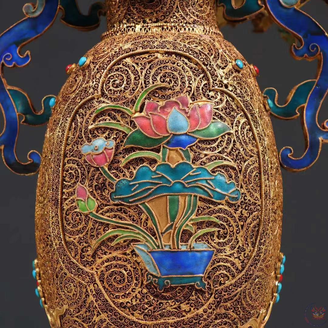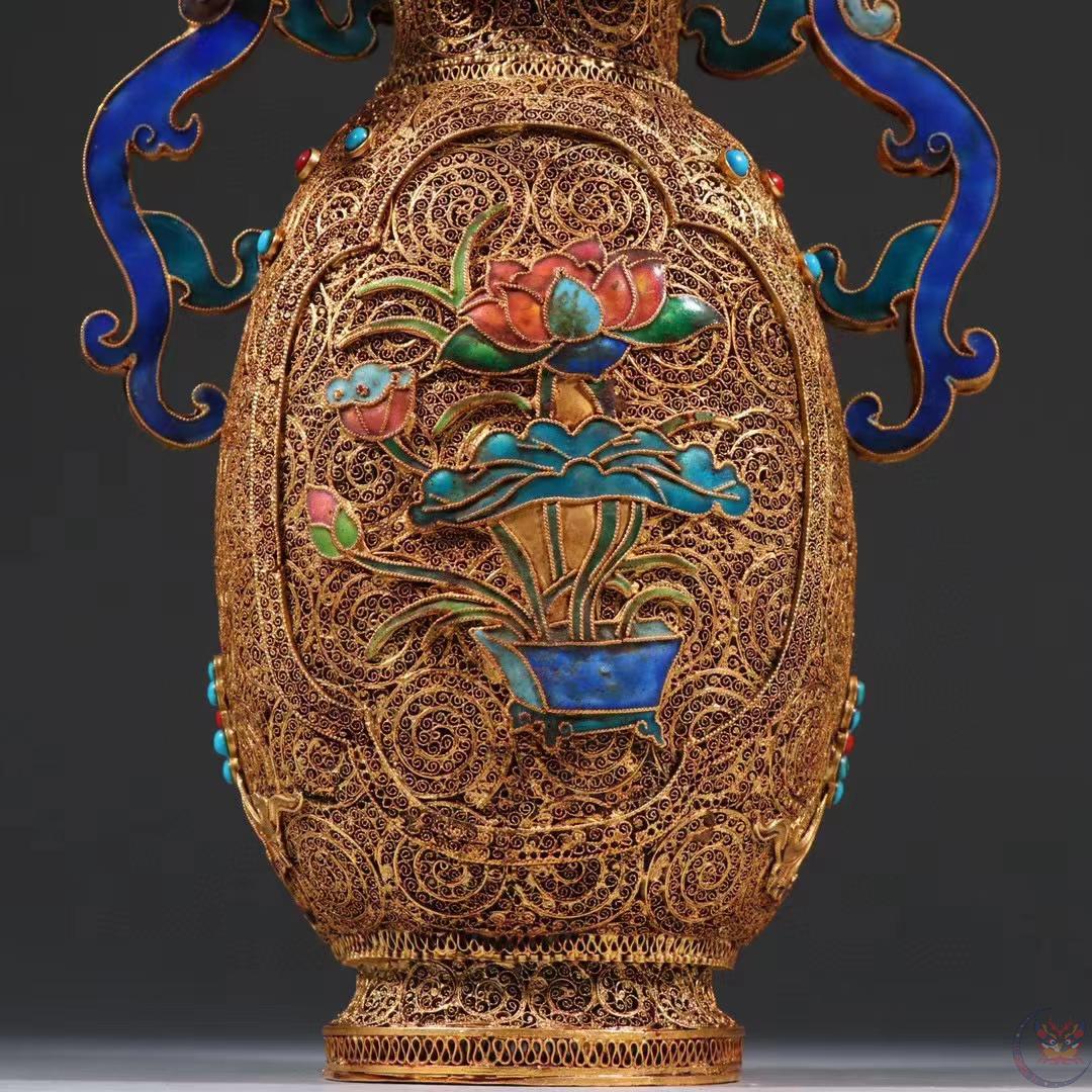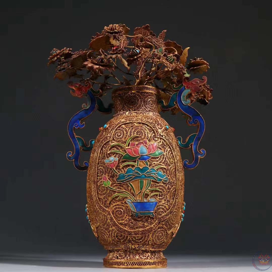 产品名称 : | 清代 银花丝烤蓝花瓶。 规格:高26.5cm 宽19cm 重715g 瓶身四面满工錾刻缠枝花卉,烧蓝工艺精湛,纹饰精美繁华,金碧辉煌、极具赏玩性,收藏价值高。 |