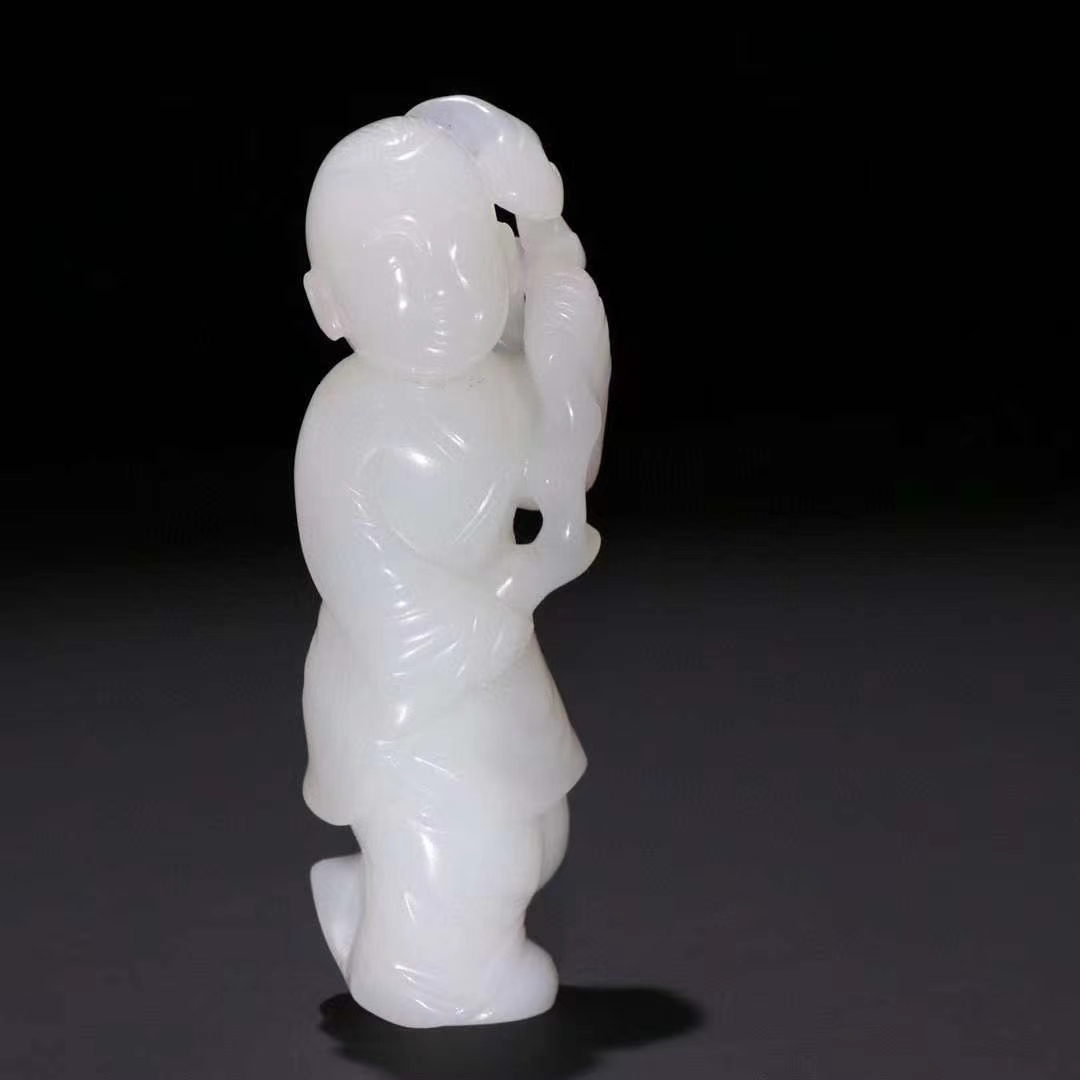 晚清 和田玉籽料如意童子。 规格:高8.2cm 宽3cm 重60.7g 一级白玉籽料,玉质细腻,童子五官开脸清晰,题材好,寓意好,工艺精湛,玉质白润,油性突出,品相完美难得。
